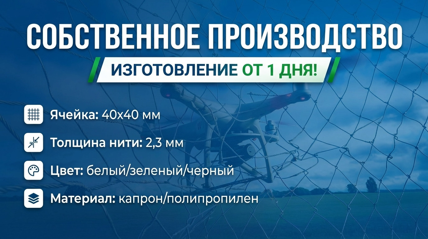 Защитная сетка от БПЛА — безузловая капрон/полипропиленовая конструкция с квадратной ячейкой 40×40 мм и толщиной нити 2,3 мм, доступна в белом, зелёном и чёрном.
