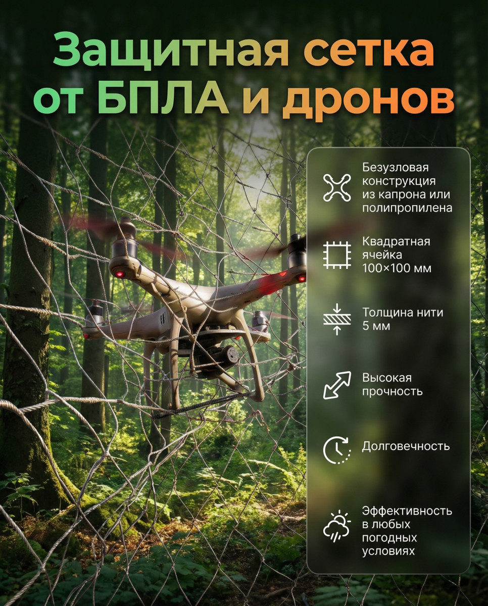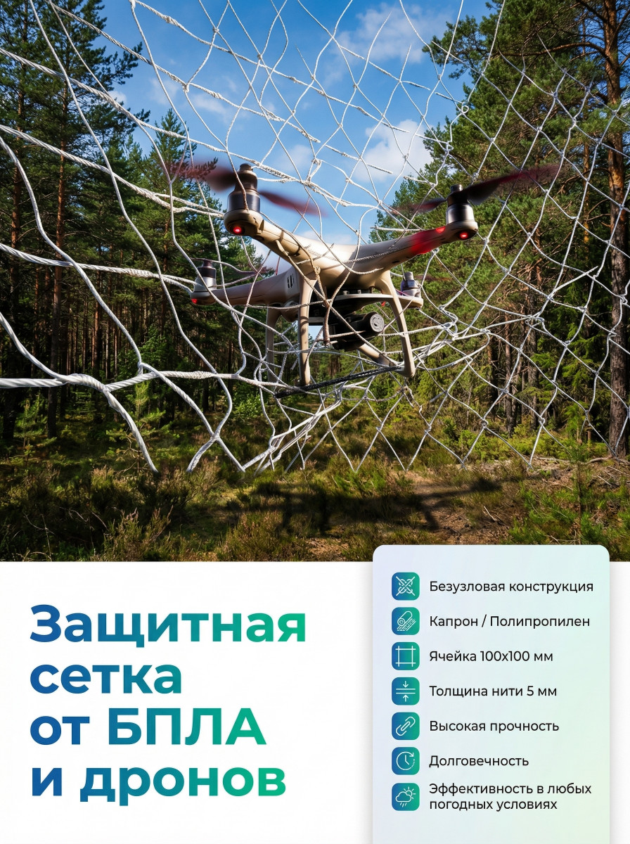 Защитные сетки от дронов и БПЛА — надёжное решение для защиты от воздушных угроз: безузловая конструкция из капрона или полипропилена с квадратной ячейкой 100×100 мм и толщиной нити 5 мм обеспечивает высокую прочность, долговечность и эффективность в любых погодных условиях.